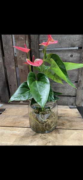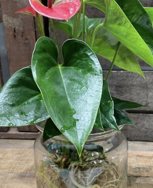 Anthurium pink in glass vase comes in a clear glass vase, allowing you to admire its twining network of roots. This eyecatching soiless display makes a fascinating focal point that captures the latest trend for hydroponic house plants. This bareroot Anthurium is easy to grow