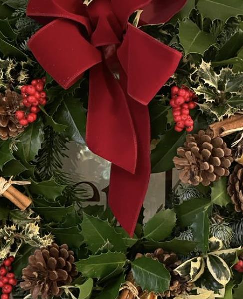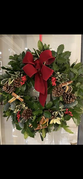 Deluxe Hand crafted holly wreath. featuring mixed Christmas foliage, cinnamon sticks, orange slices, pine cones and berries. Finished with a luxurious red velvet box.