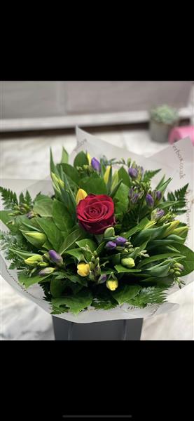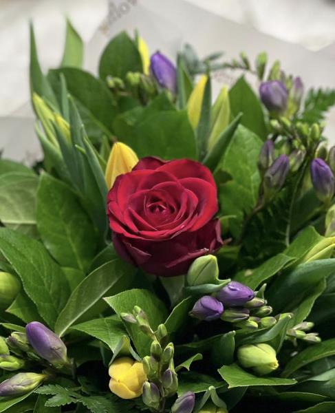 Tulips and Freesia with a single red rose.