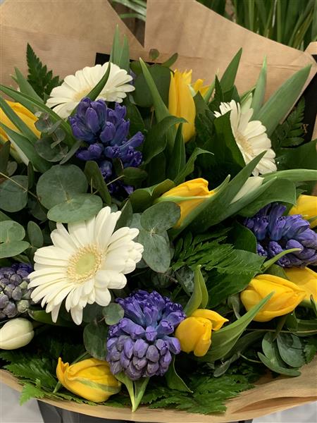 Spring tulip and hyacinth hand tied