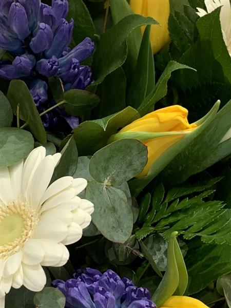Yellow and white tulips with blue hyacinth and white germini