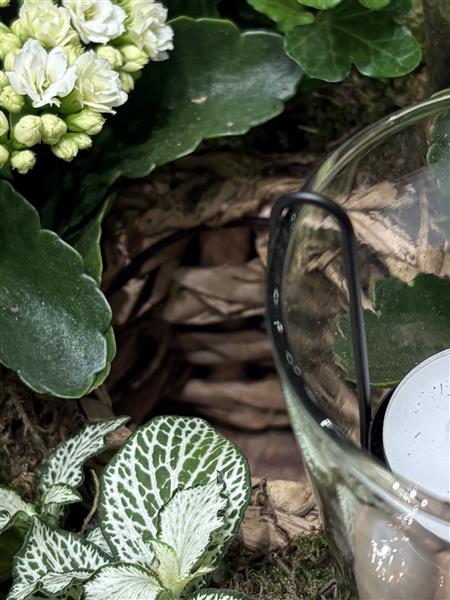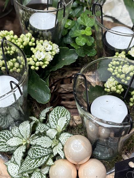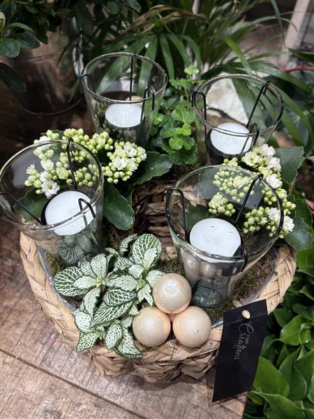 White winter planted table arrangement with tea lights. approx 11" in diameter